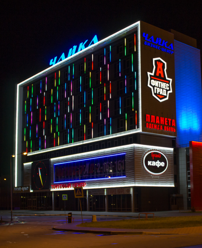 Декоративная подсветка фасада здания бизнес центра "Чайка" на проспекте Ленина города Нижний Новгород выполнена силами нашей компании.
