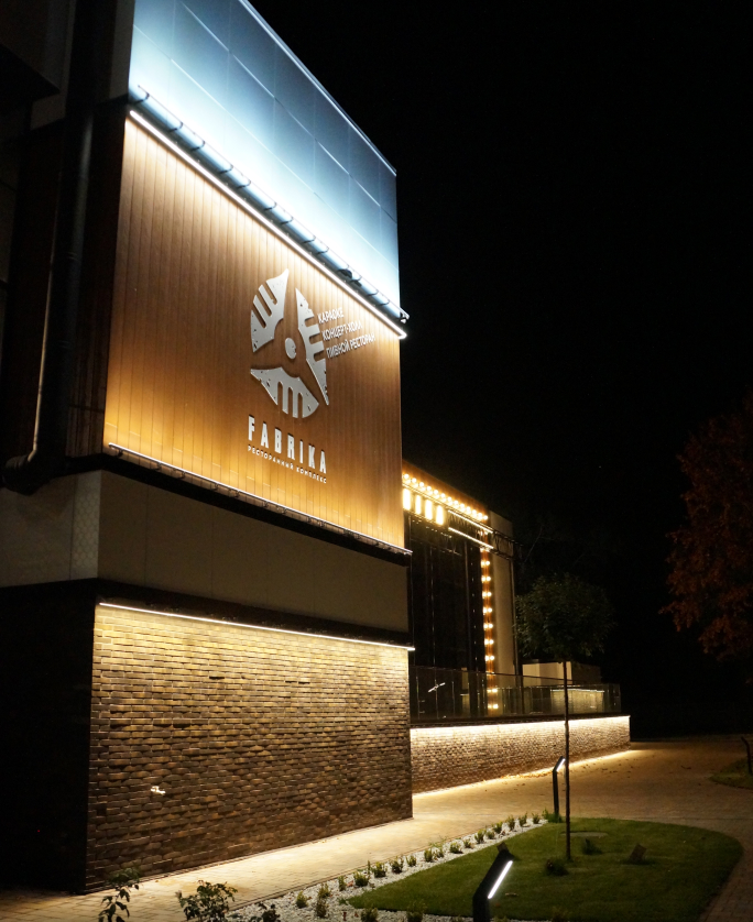 Архитектурная подсветка фасада ресторанного комплекса Fabrika в городе Брянск.