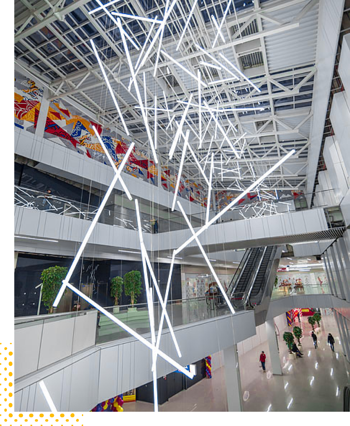 В рамках проекта были произведены и установлены декоративные светодиодные люстры для освещения торговых галерей ТРЦ.